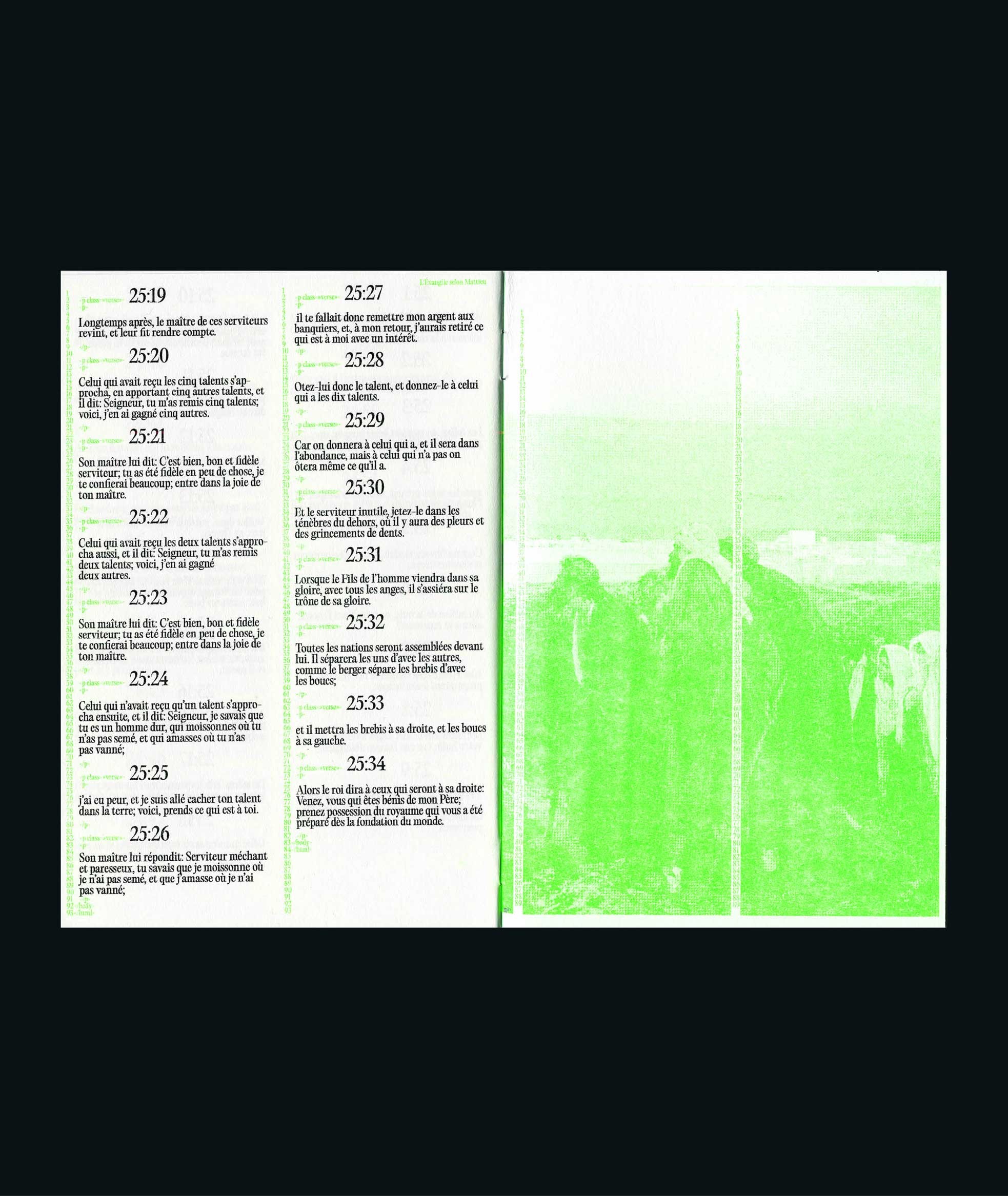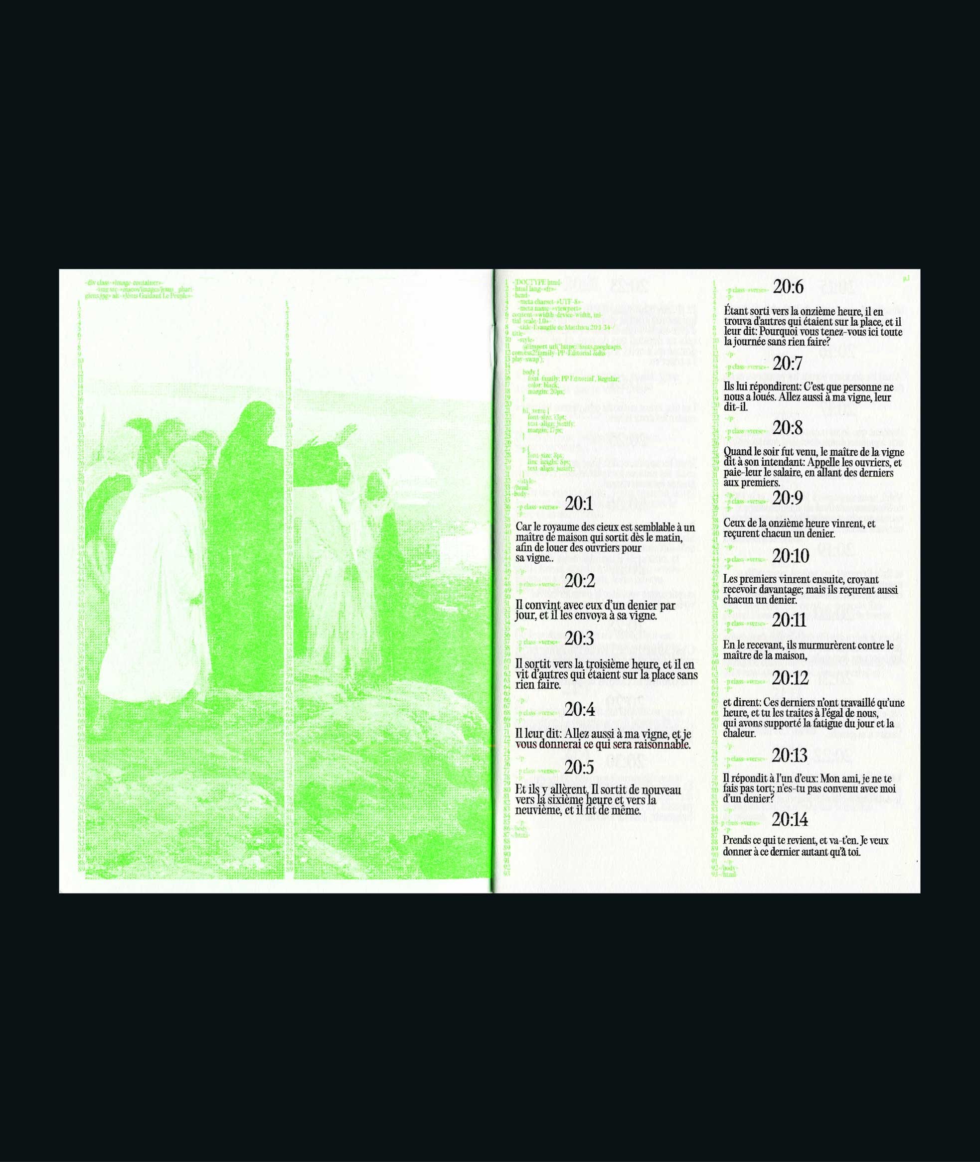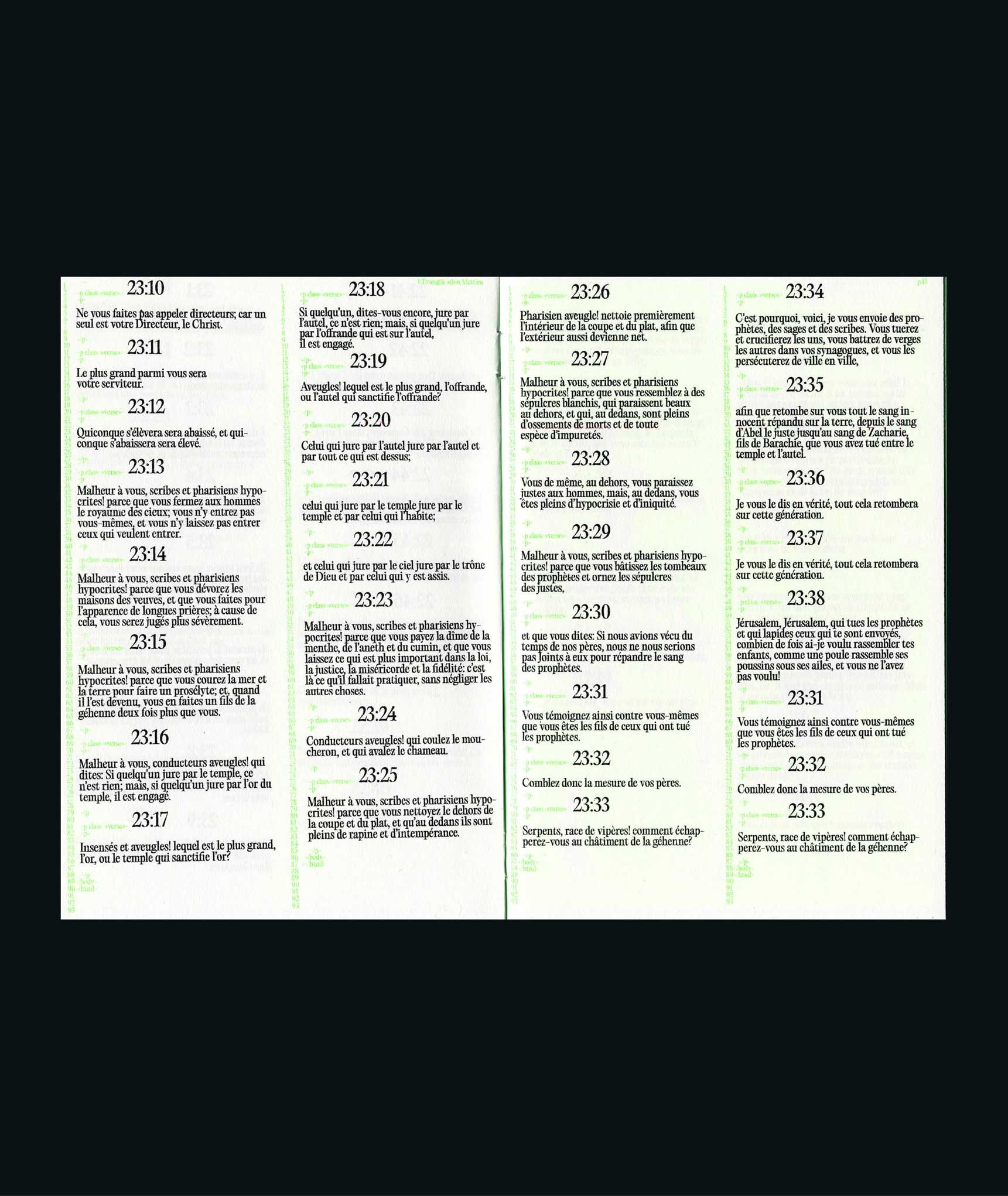 I decided to try to translate Matthew’s Gospel in HTLM code. The idea was to understand how could I include codes in prints and to create a contrast between one of the first printed book and our new technologies.