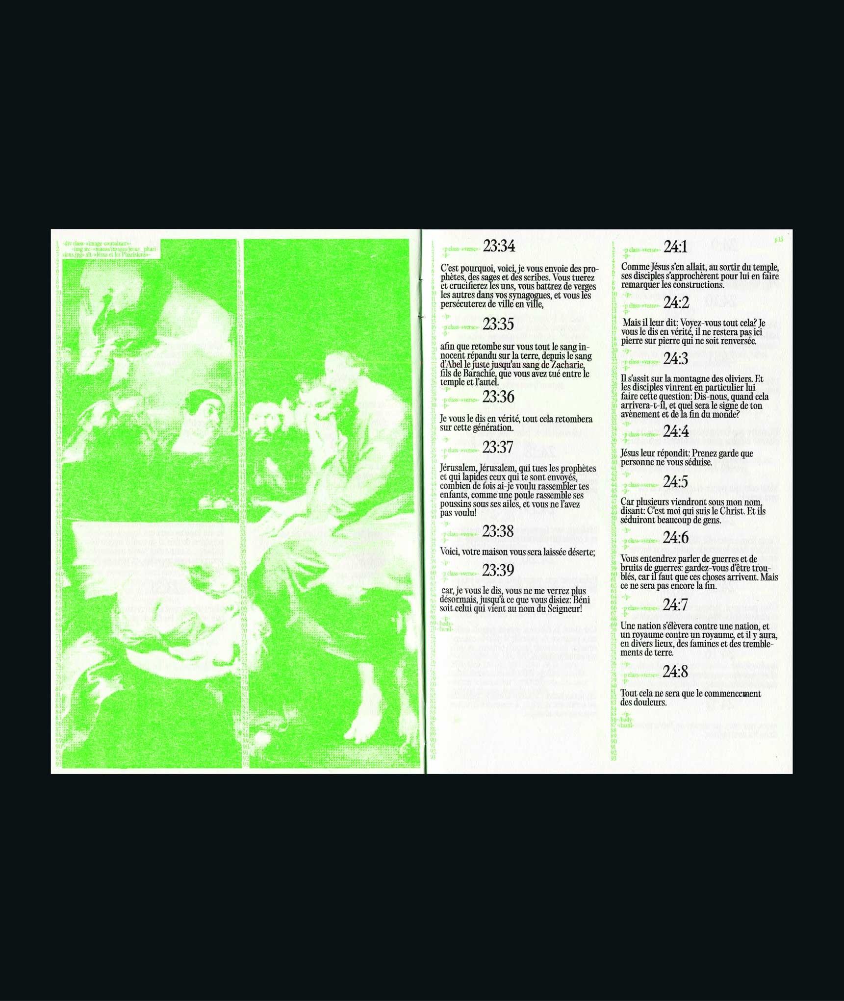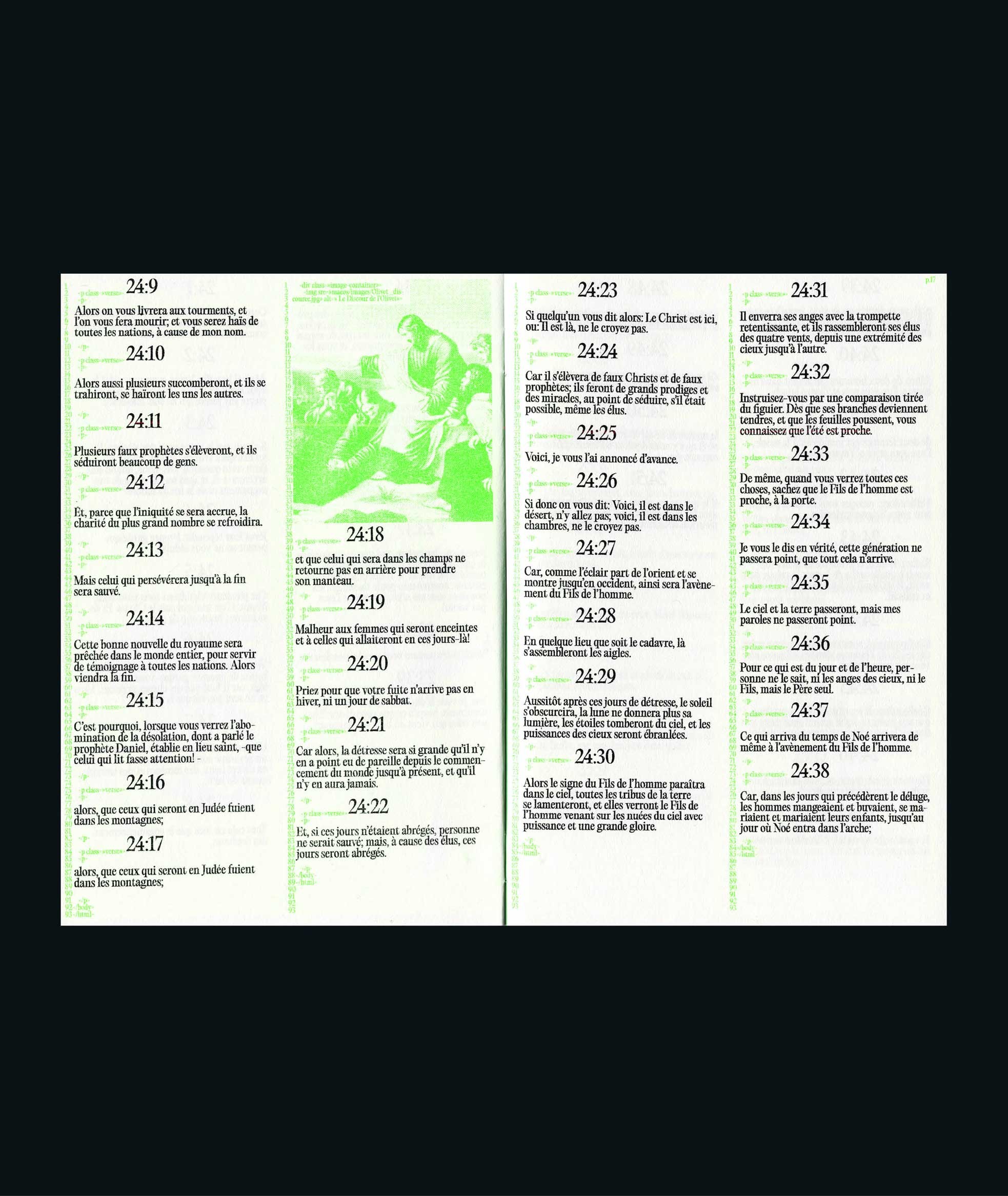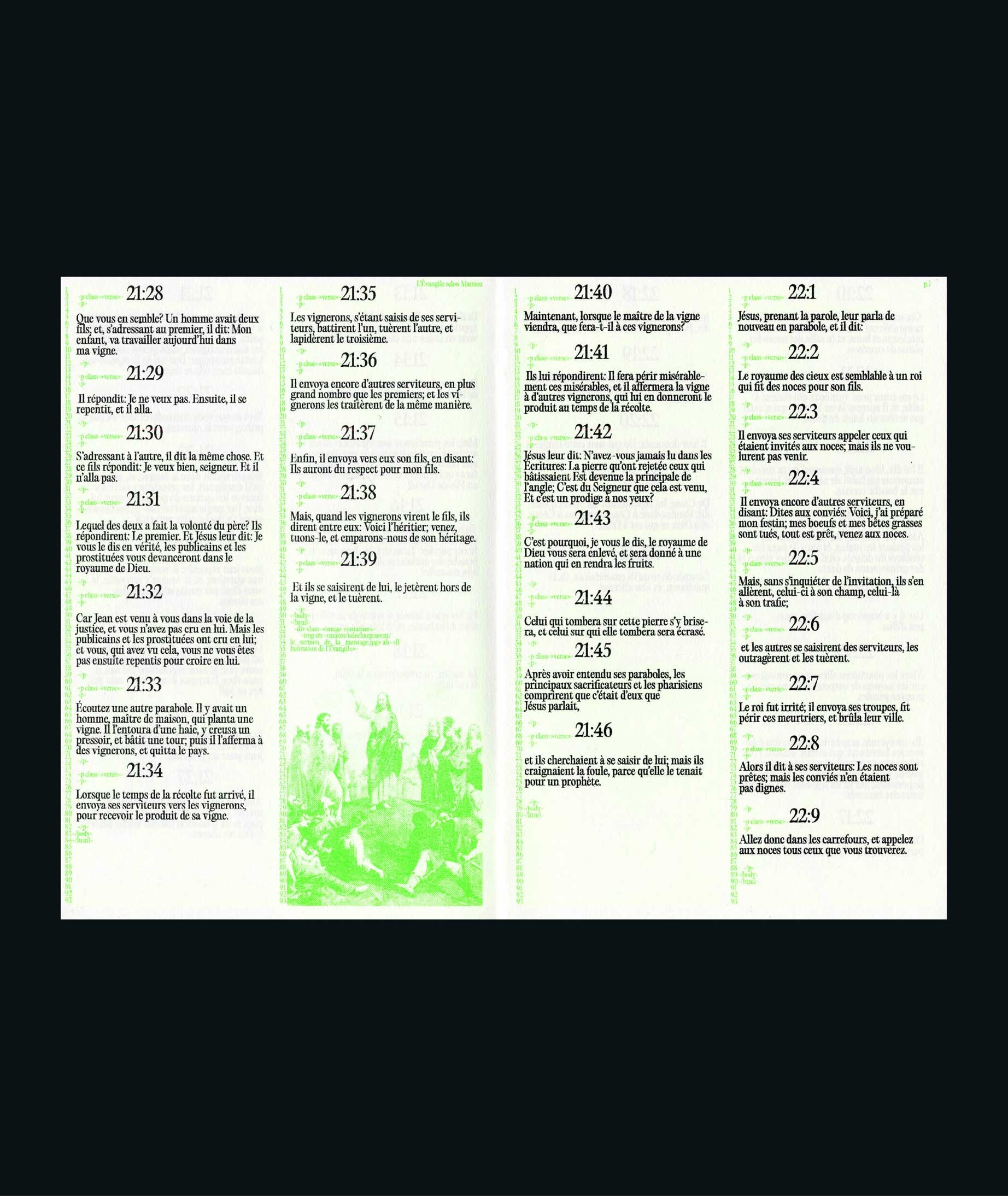 I decided to try to translate Matthew’s Gospel in HTLM code. The idea was to understand how could I include codes in prints and to create a contrast between one of the first printed book and our new technologies.