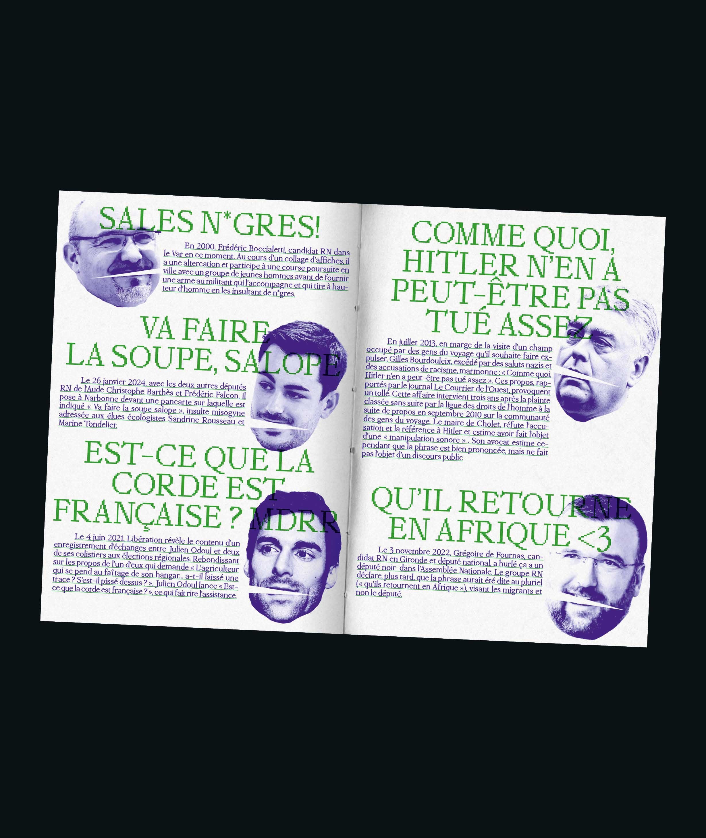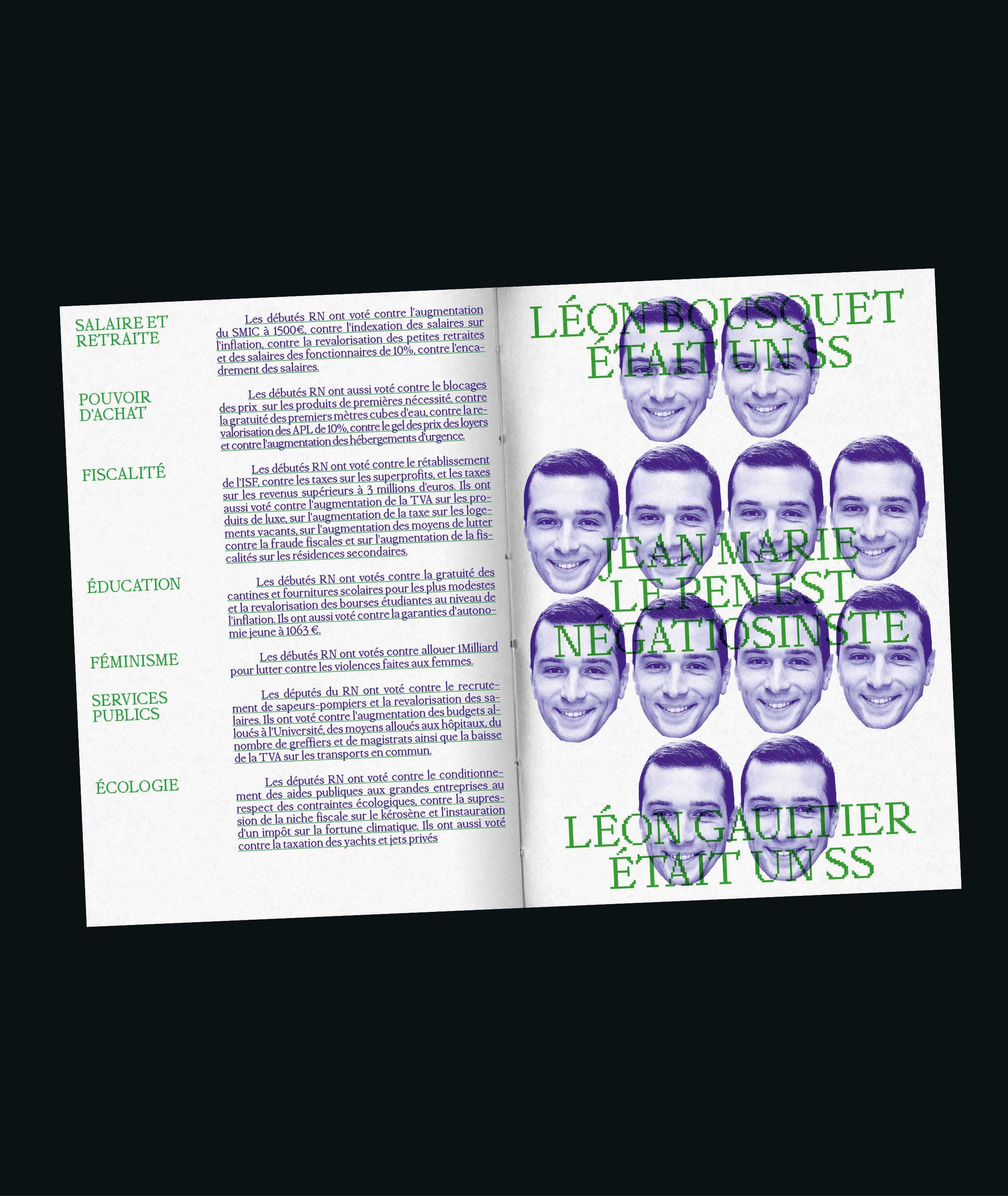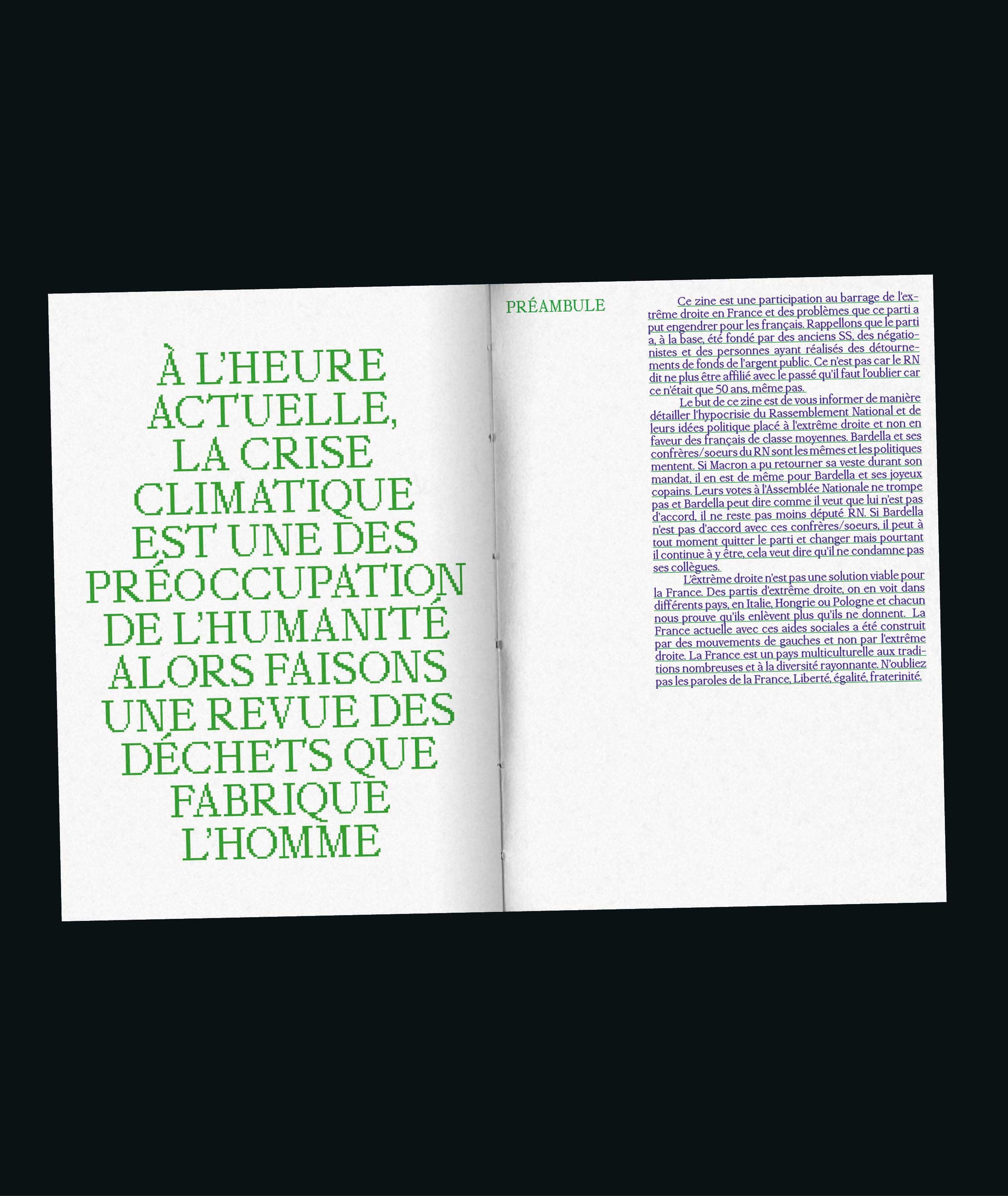 This zine was made to stand against the rise of Rassemblement Nation (far right political group) in France. The zine figure different information about trash and waste produced by human among information about RN and its deputies