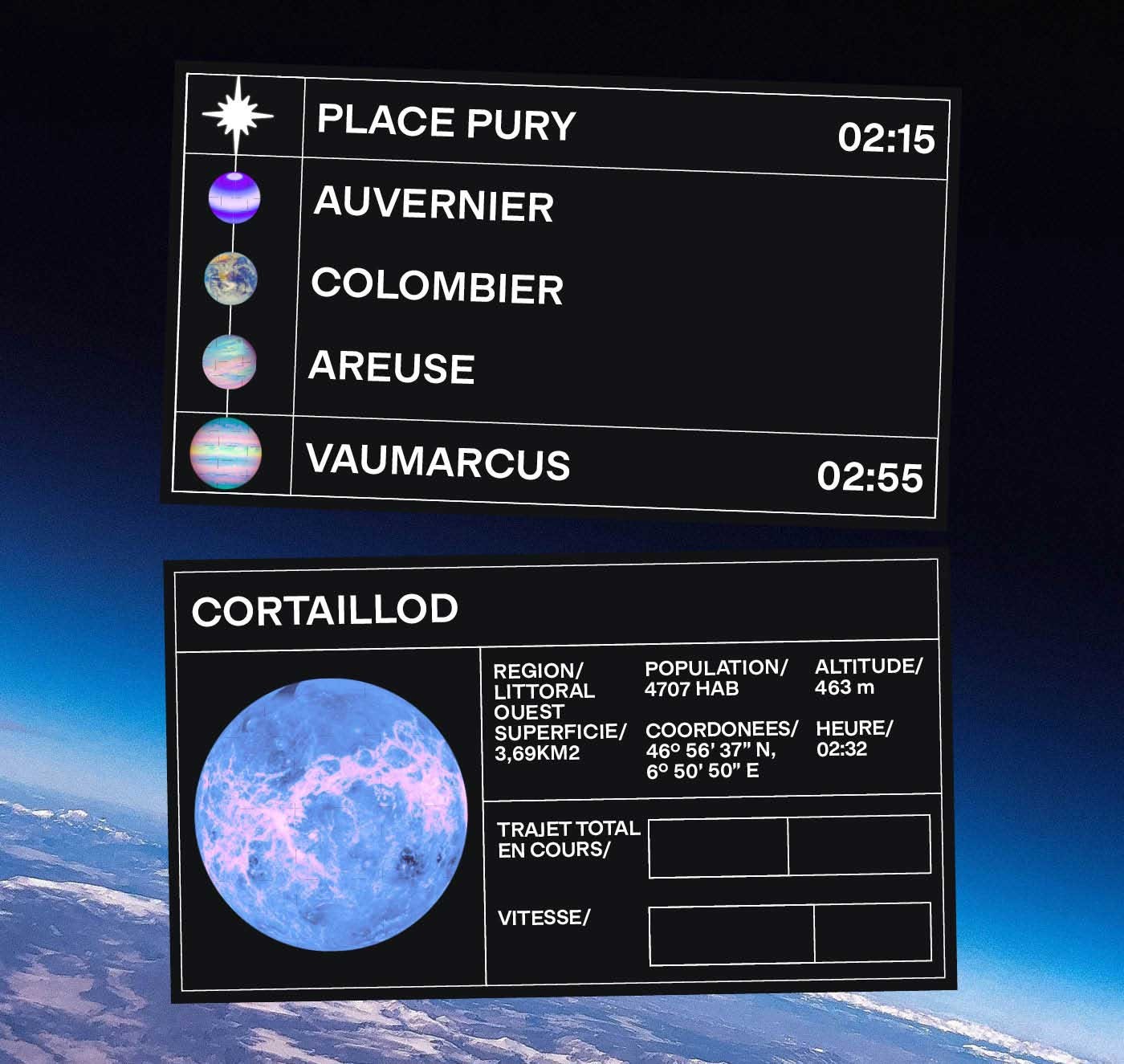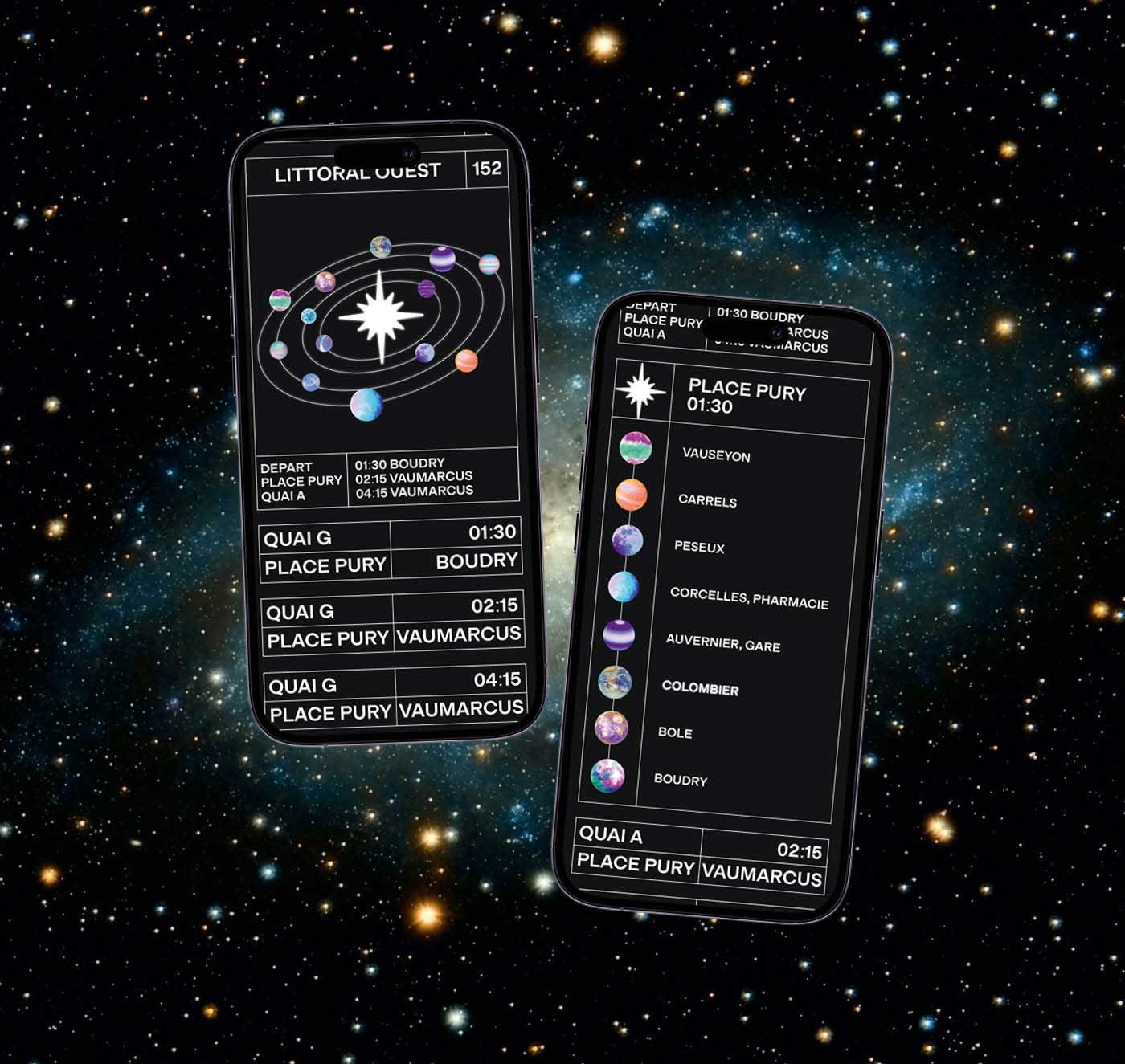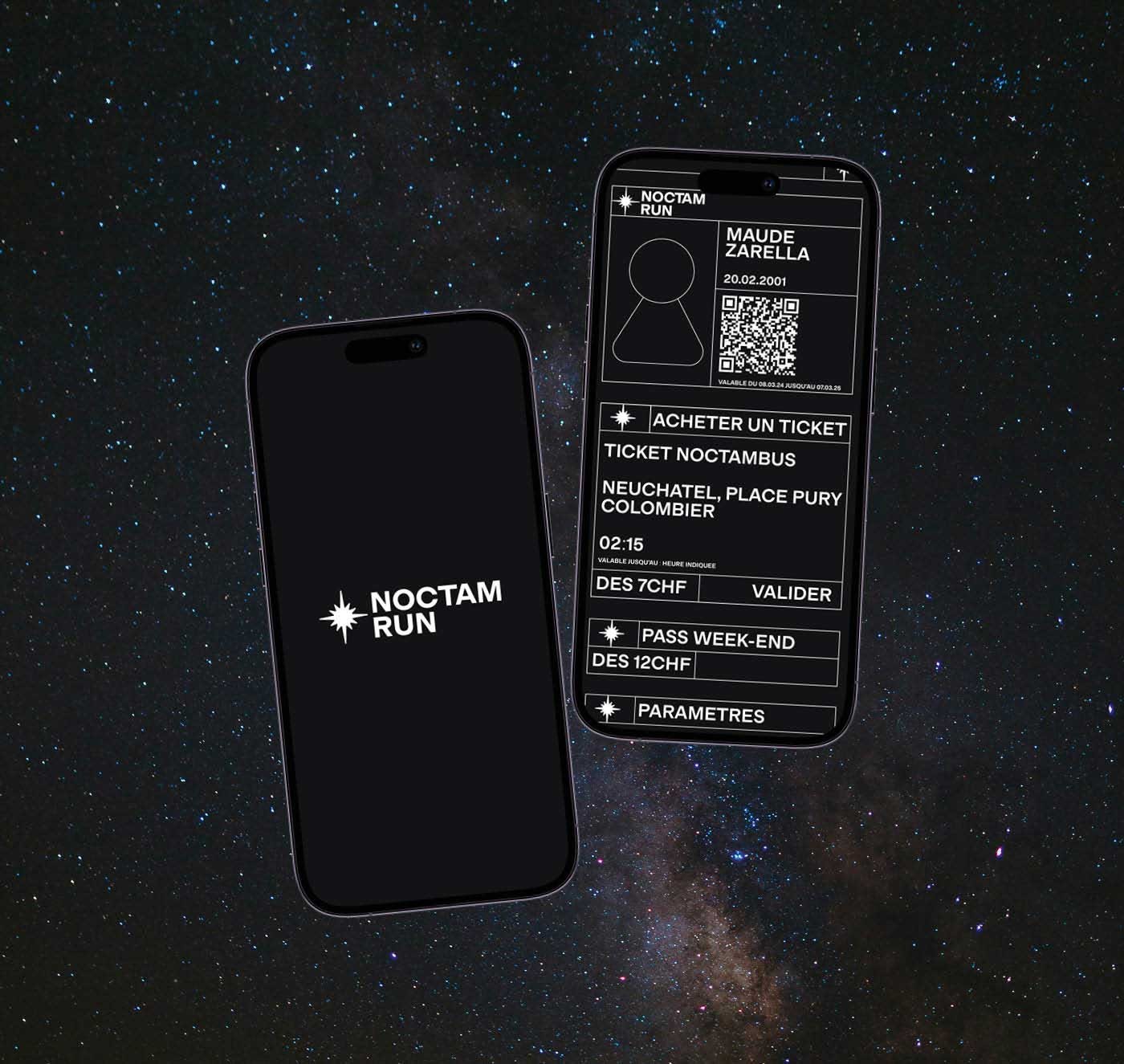 For our third-year exam, we had to create a complete visual identity for the night buses in the canton of Neuchâtel. I positioned myself in a identity inspired by space and dashboard imagery. The aim of the message is to tell young adults that they can dream and escape with bus service.